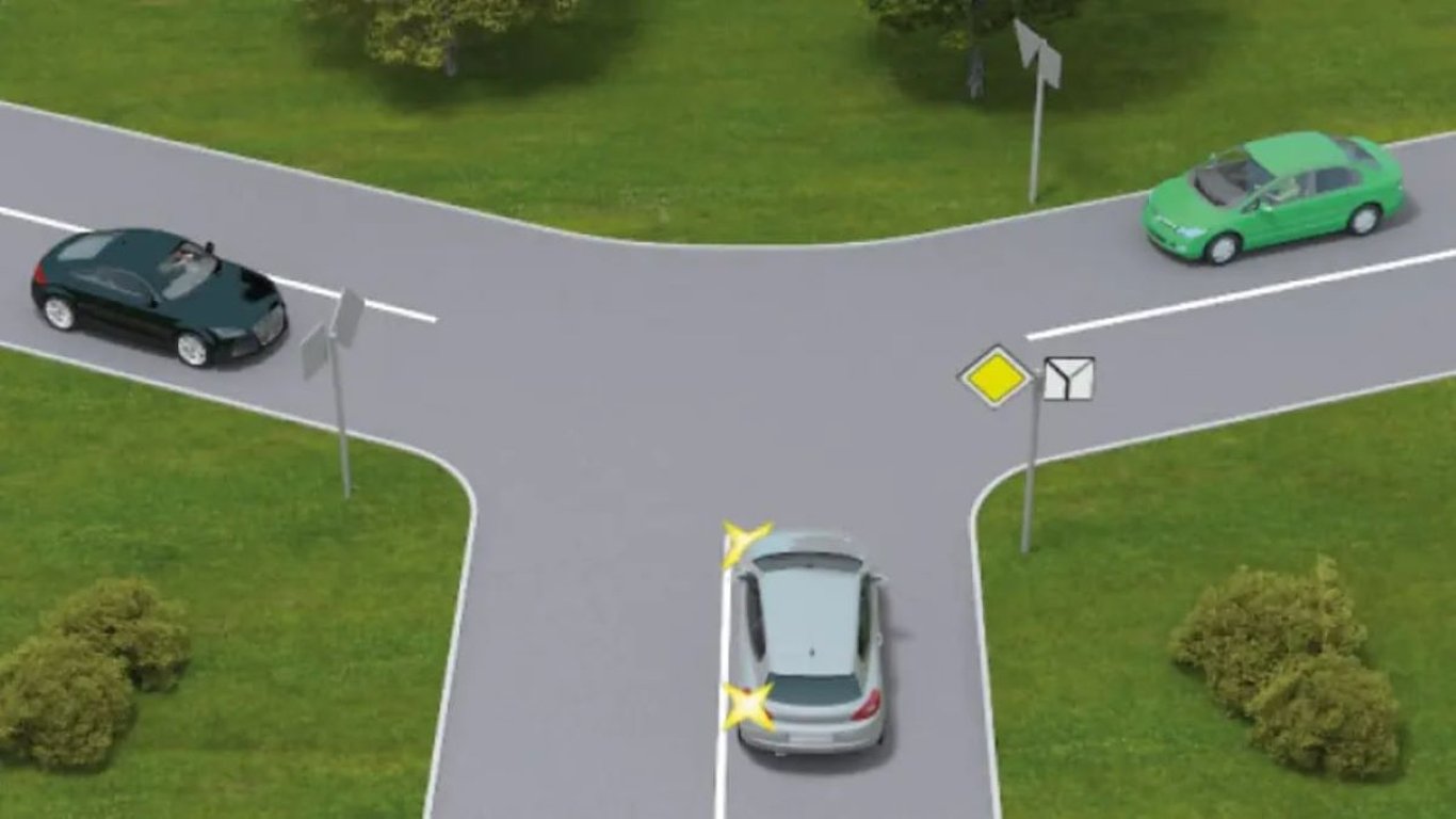 Задача з теми проїзд перехресть. Що повинен зробити водій сірого автомобіля в зображеній на малюнку ситуації?
