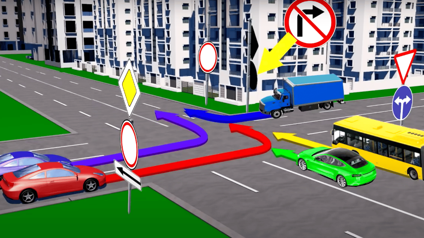 Наостанок, водій автобуса, який перебуває на другорядній дорозі, про що свідчить знак 2.1 "Дати дорогу", має спочатку пропустити синю машину, яка має пріоритет згідно зі знаком 2.3 "Головна дорога".