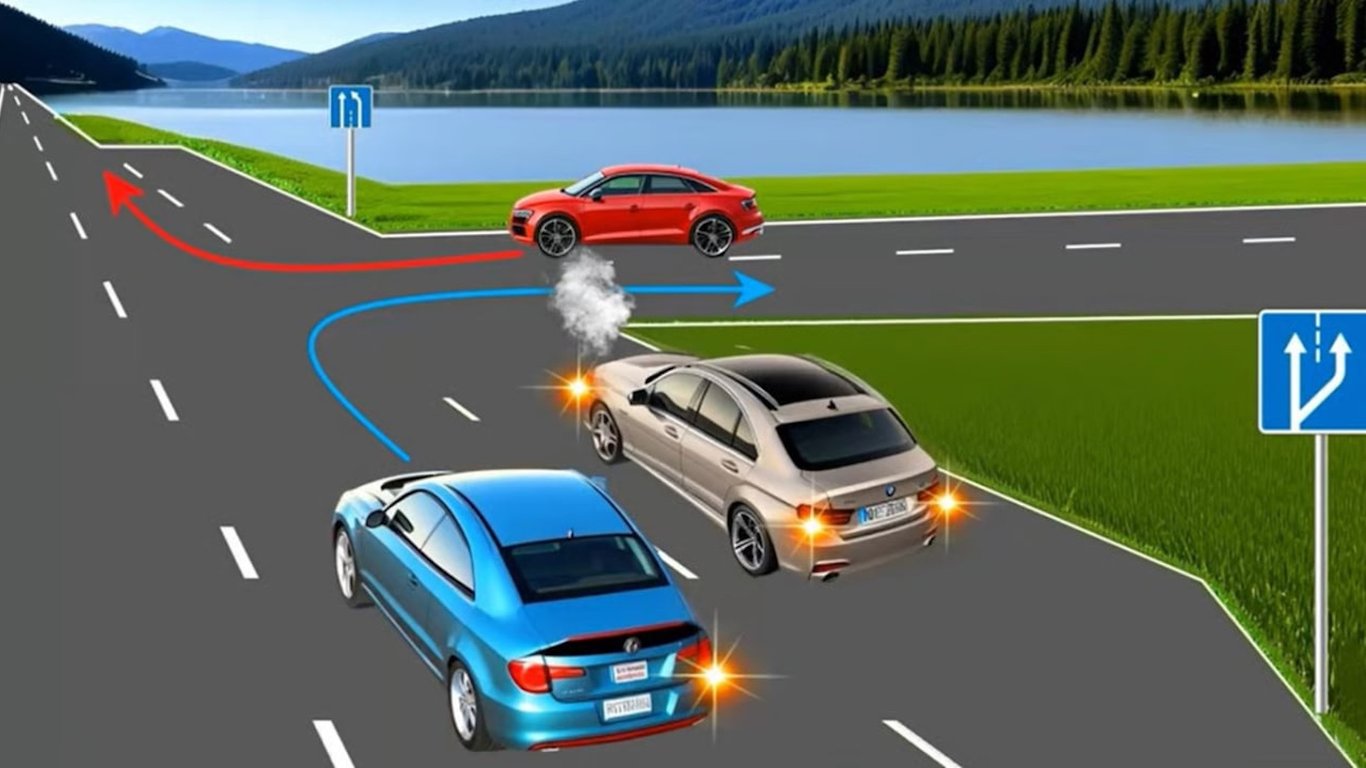 Сіра машина стоїть з увімкненими аварійними вогнями, а водії синього та червоного автомобілів повертають праворуч. На ділянці дороги є смуга для гальмування, про що свідчить знак 5.20.2 "Початок додаткової смуги". Ця додаткова смуга є водночас й смугою для розгону водія червоної автівки.