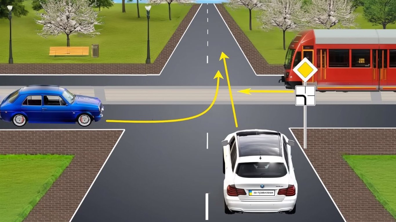 Трамвай та біла машина проїжджають прямо, а синій автомобіль повертає ліворуч. На перехресті встановлені знаки пріоритету, котрі допоможуть побудувати правильний порядок роз'їзду.