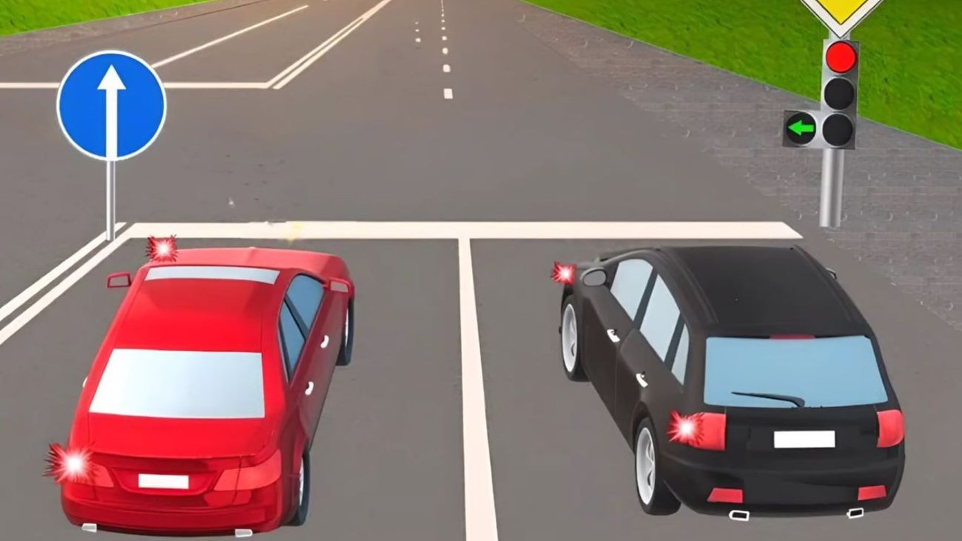 Світлофор дозволяє повернути ліворуч водієві червоного автомобіля, але перед ним встановлено знак 4.1 "Рух прямо".