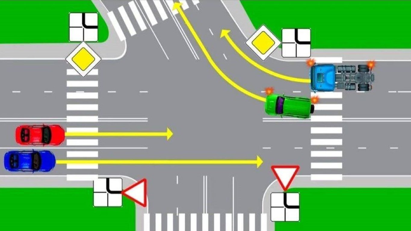На перехресті водій червоного автомобіля рухається прямо, а водій зеленого має намір повернути праворуч. При цьому обидва виконують випередження.