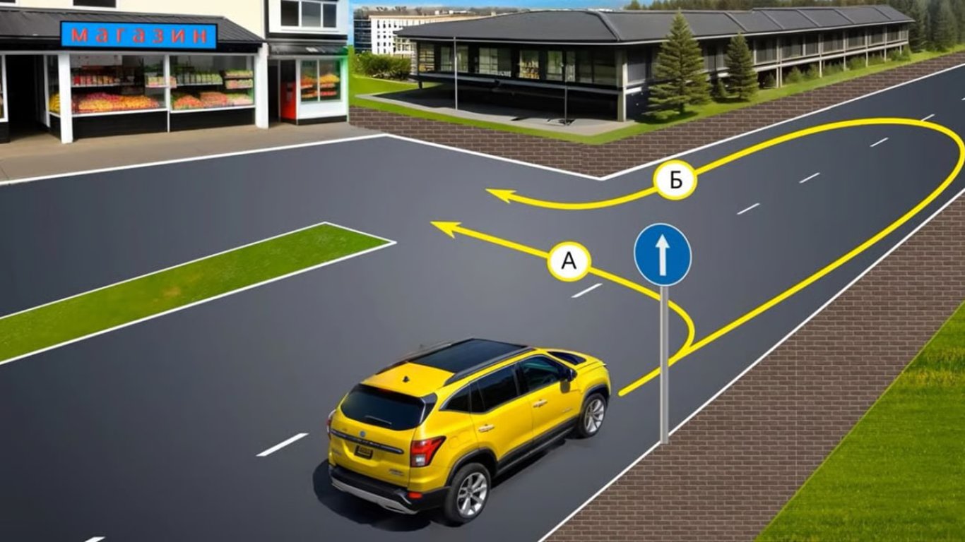 Водій жовтого автомобіля має намір повернути ліворуч, щоб заїхати до магазину. Перед собою водій бачить дорожній знак 4.1 "Рух прямо", який дозволяє рух лише прямо, а отже, траєкторія А точно заборонена.