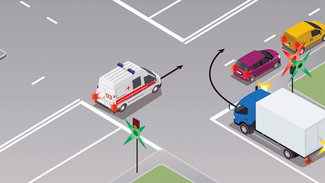 Попри те, що швидка їде з вимкненими спеціальними сигналами, водій вантажівки перед поворотом мусить дати їй дорогу, адже він їде у напрямку зеленої стрілки увімкненої у додатковій секції світлофора при основному червоному.