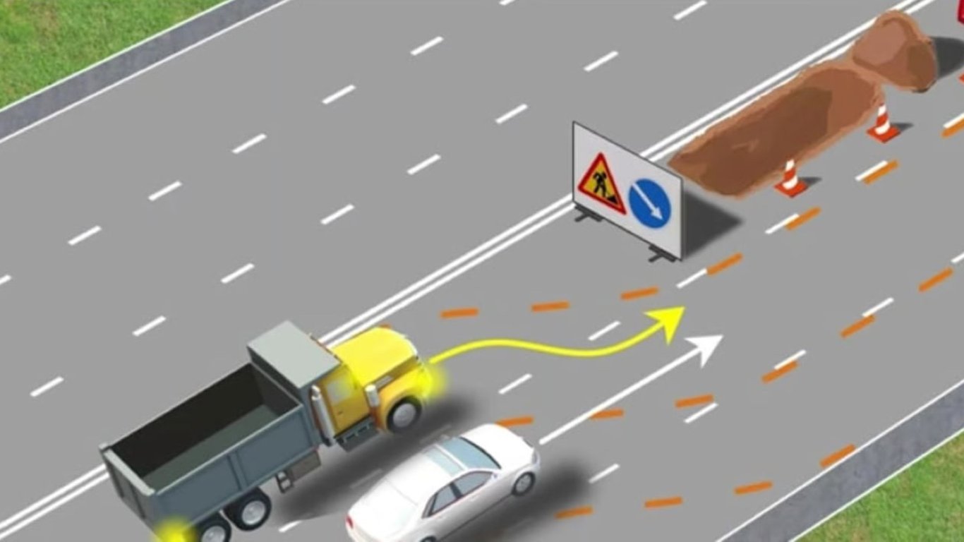 За схемою тимчасової розмітки, водій вантажівка продовжує рух у своїй смузі. А водій білого авто перестроюється.