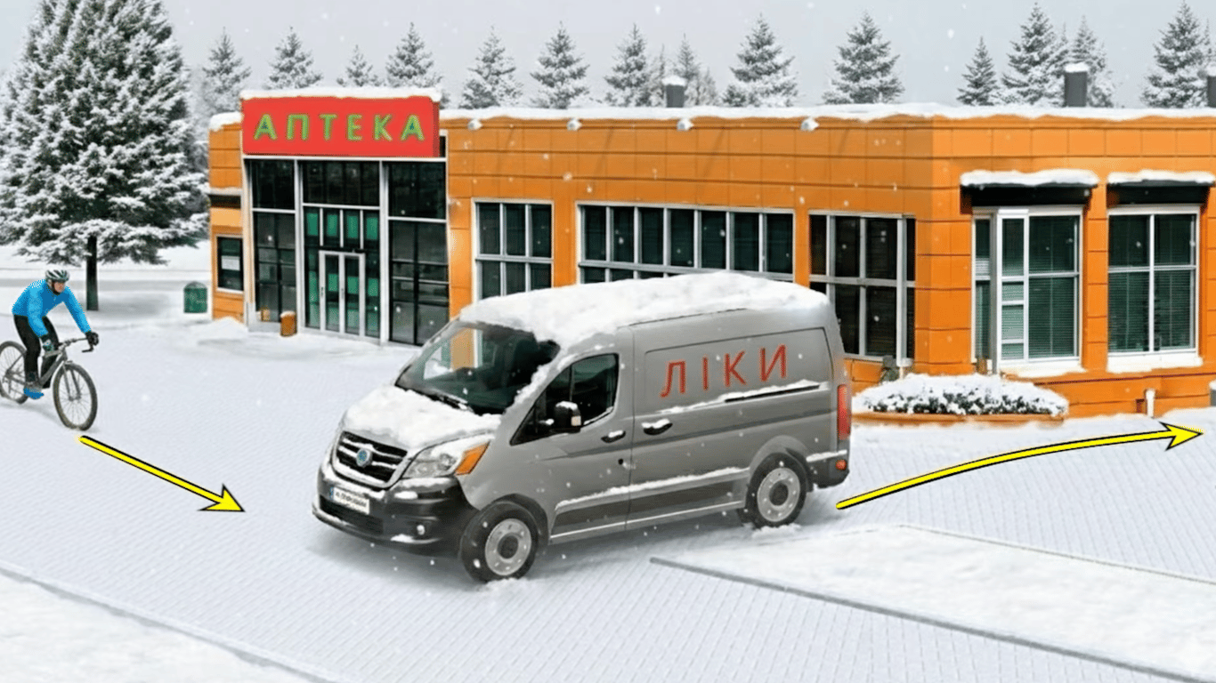 Водій мікроавтобуса з написом "Ліки" під'їжджає до аптеки для її обслуговування, тому його дії правомірні. Натомість велосипедистам рух по тротуарах заборонено за будь-яких умов, вони мають рухатися проїзною частиною.