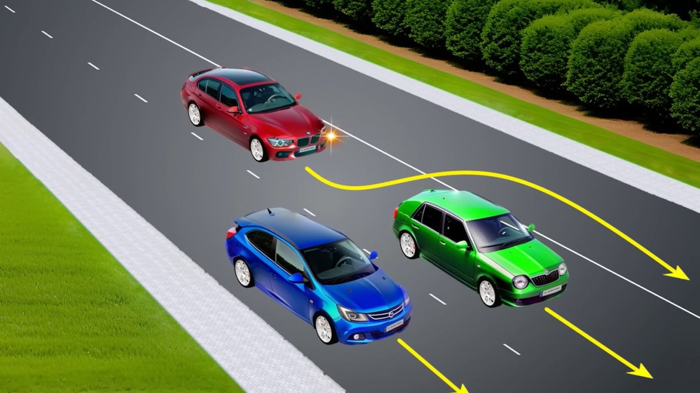 На ділянці дороги водії синього та зеленого автомобілів їдуть прямо, а водій червоної машини має намір їх обігнати.