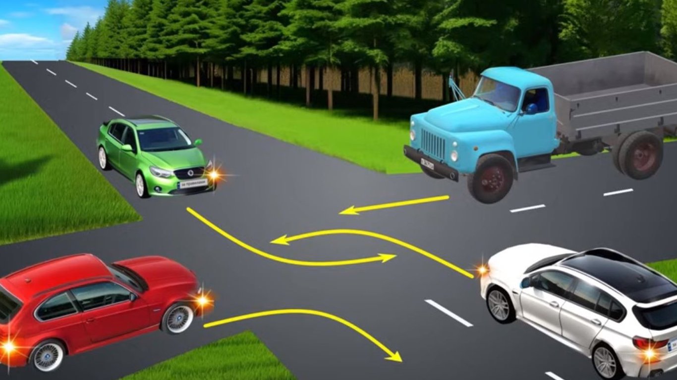 Червоний автомобіль повертає праворуч, зелений та білий — ліворуч, а вантажівка проїжджає прямо.