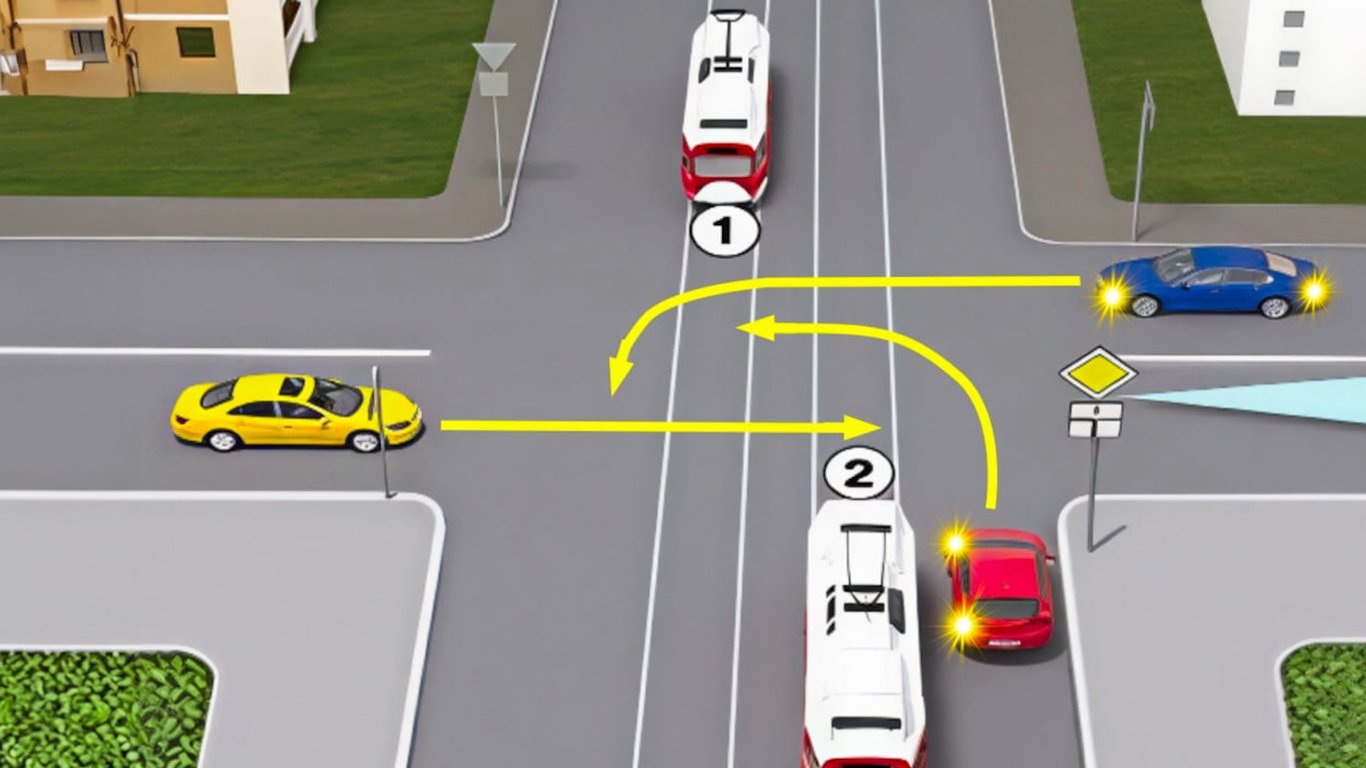 На перехресті водії трамваїв та жовтого автомобіля проїжджають прямо, а водії червоної та синьої машин повертають ліворуч.