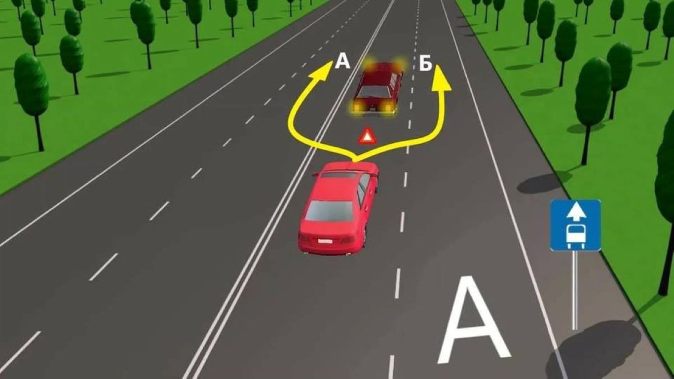 Задача з теми про перевагу маршрутних транспортних засобів. За якою траєкторією водій червоного автомобіля може об’їхати зламану машину в зображеній на малюнку ситуації?