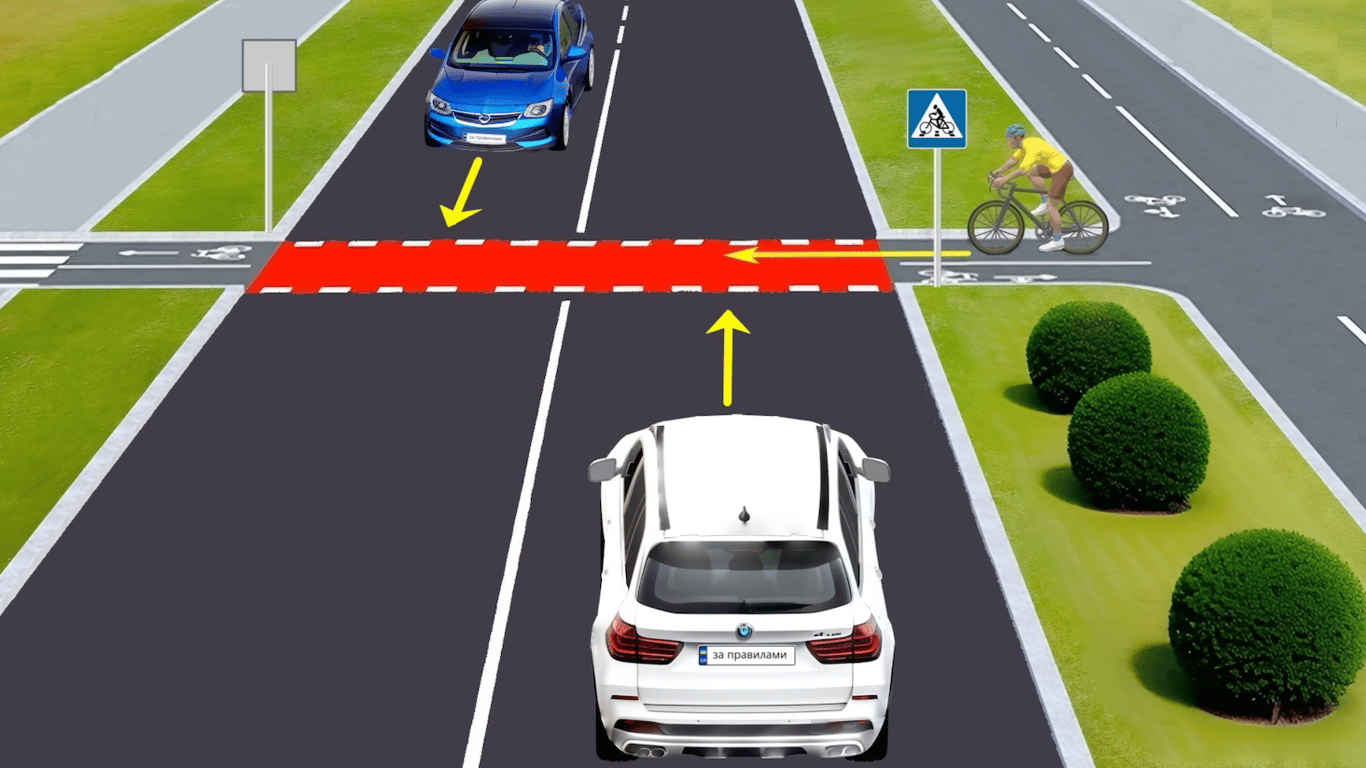 Водители белого и синего автомобиля едут прямо и приближаются к месту, где велосипедная дорожка пересекает полосы их движения.