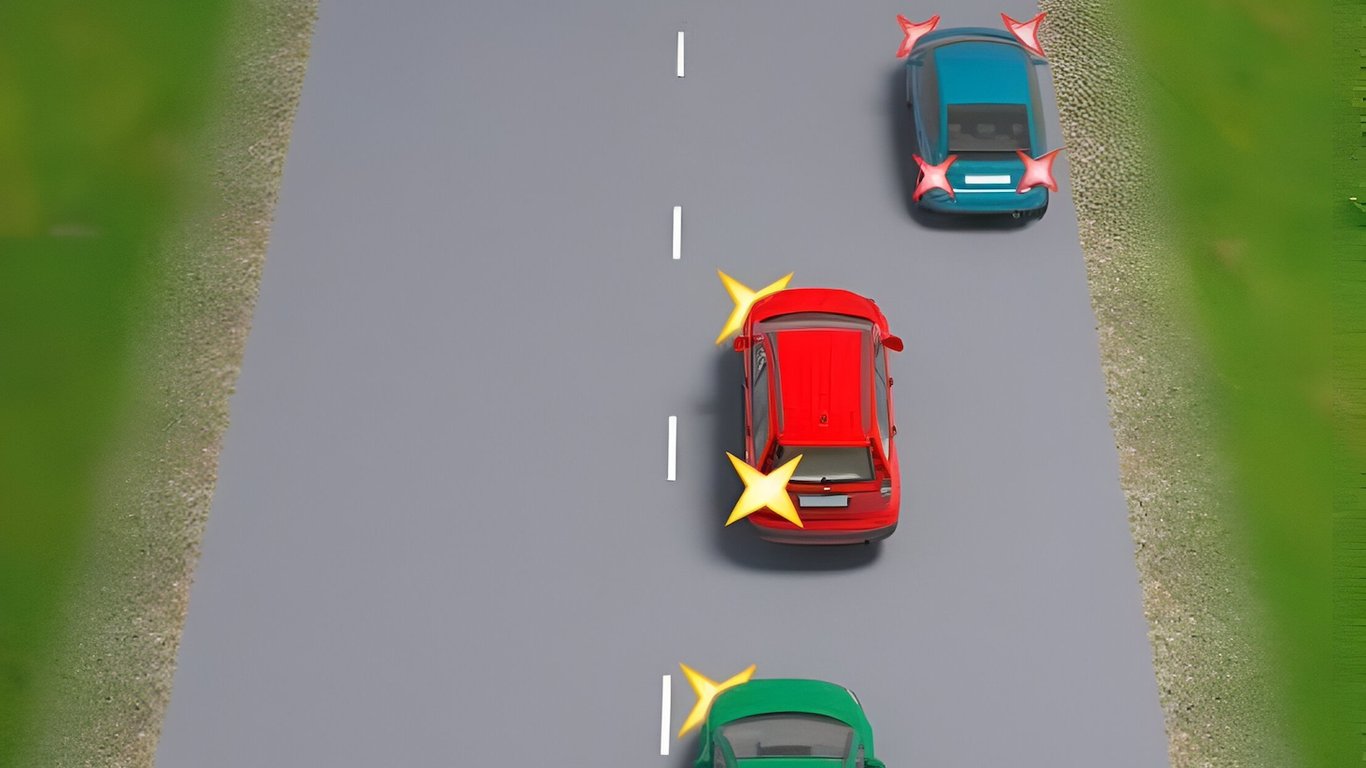 На участке дороги водитель синего автомобиля остановился на краю дороги и включил аварийную сигнализацию. Поэтому водитель красной машины выполняет объезд синего авто в пределах своей полосы без выезда на встречную. В то же время нетерпеливый водитель зеленого автомобиля намерен обогнать красную машину.