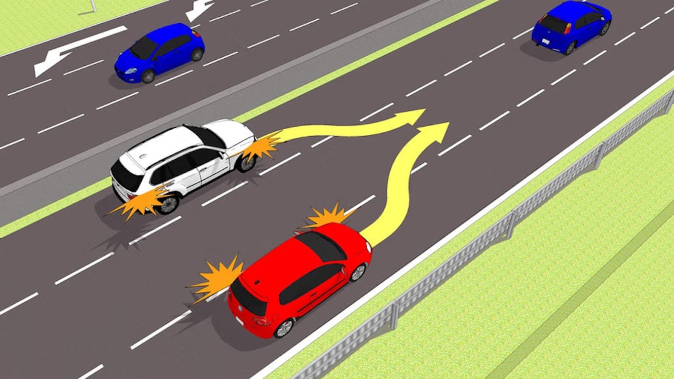 На участке трехполосной дороги водители красного и белого автомобилей намерены одновременно перестроиться в среднюю полосу.