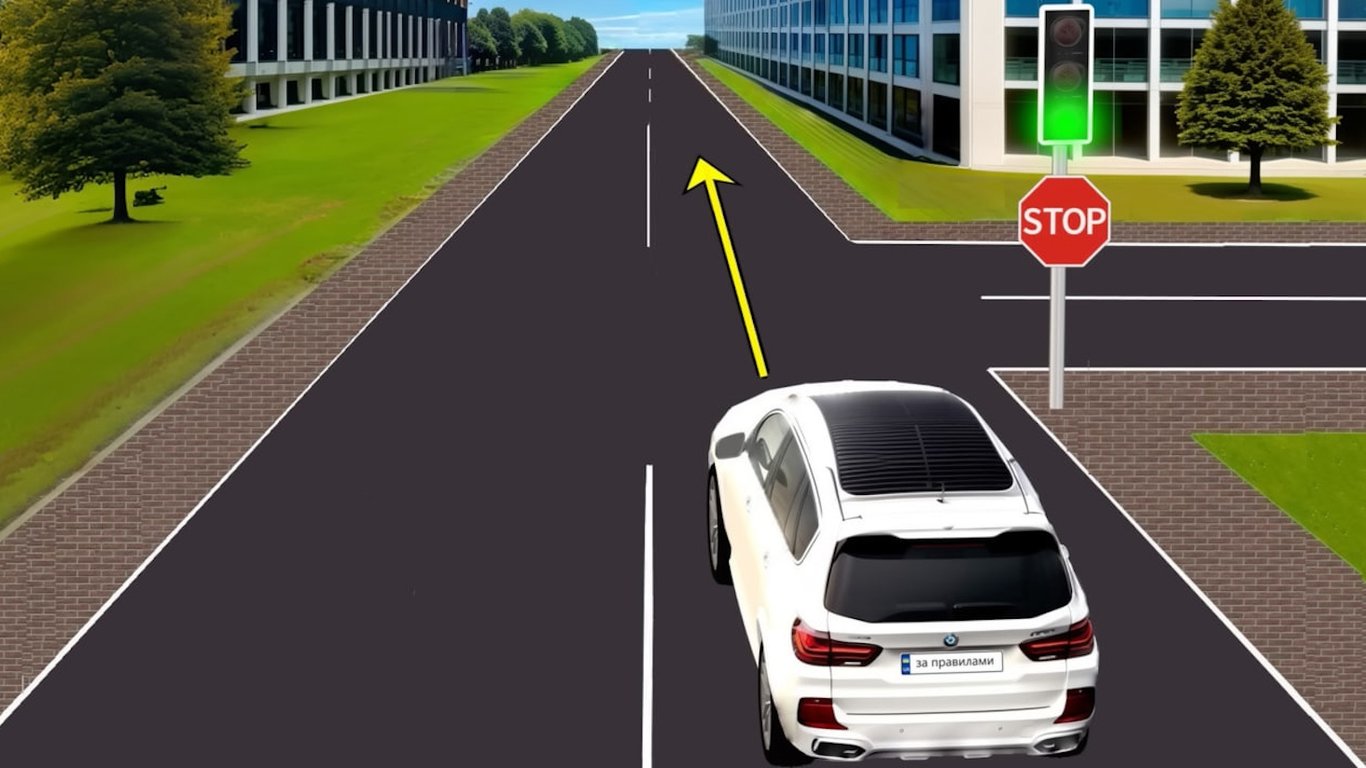 На перекрестке для водителя белого автомобиля горит зеленый сигнал светофора, который разрешает движение в любом направлении.