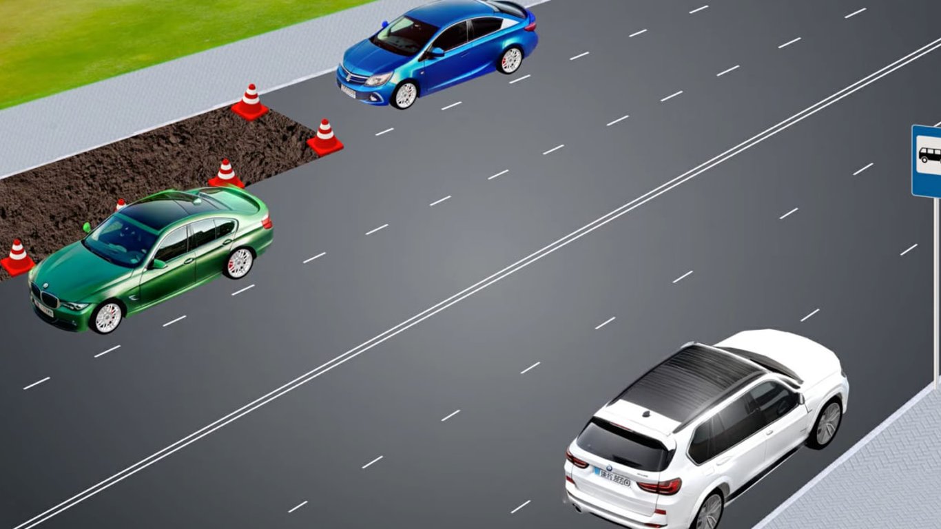 Водитель белого автомобиля стал возле остановки, которая обозначена дорожным знаком 5.45.1 "Пункт остановки автобуса", а водители синего и зеленого автомобилей — возле места выполнения дорожных работ.