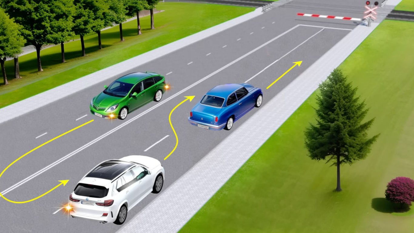 На участке перед железнодорожным переездом водитель синего автомобиля едет прямо, водитель белой машины собирается его опередить, а водитель зеленого авто намерен развернуться.