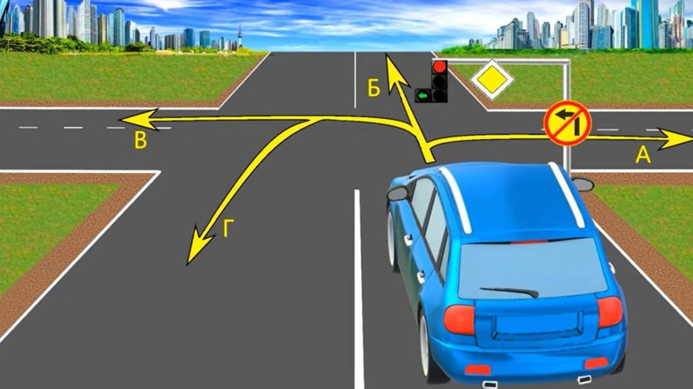 Задача на знание дорожных знаков и по теме о регулировании дорожного движения. По каким направлениям имеет право проехать водитель в изображенной на рисунке ситуации?