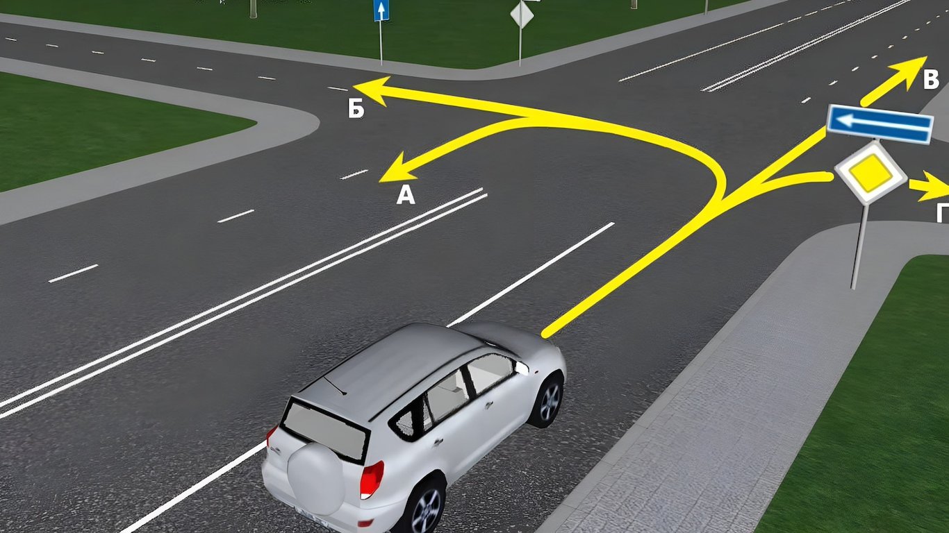 Очевидно, что поворот направо (Г) запрещен, ведь в таком случае водитель окажется на встречной полосе.