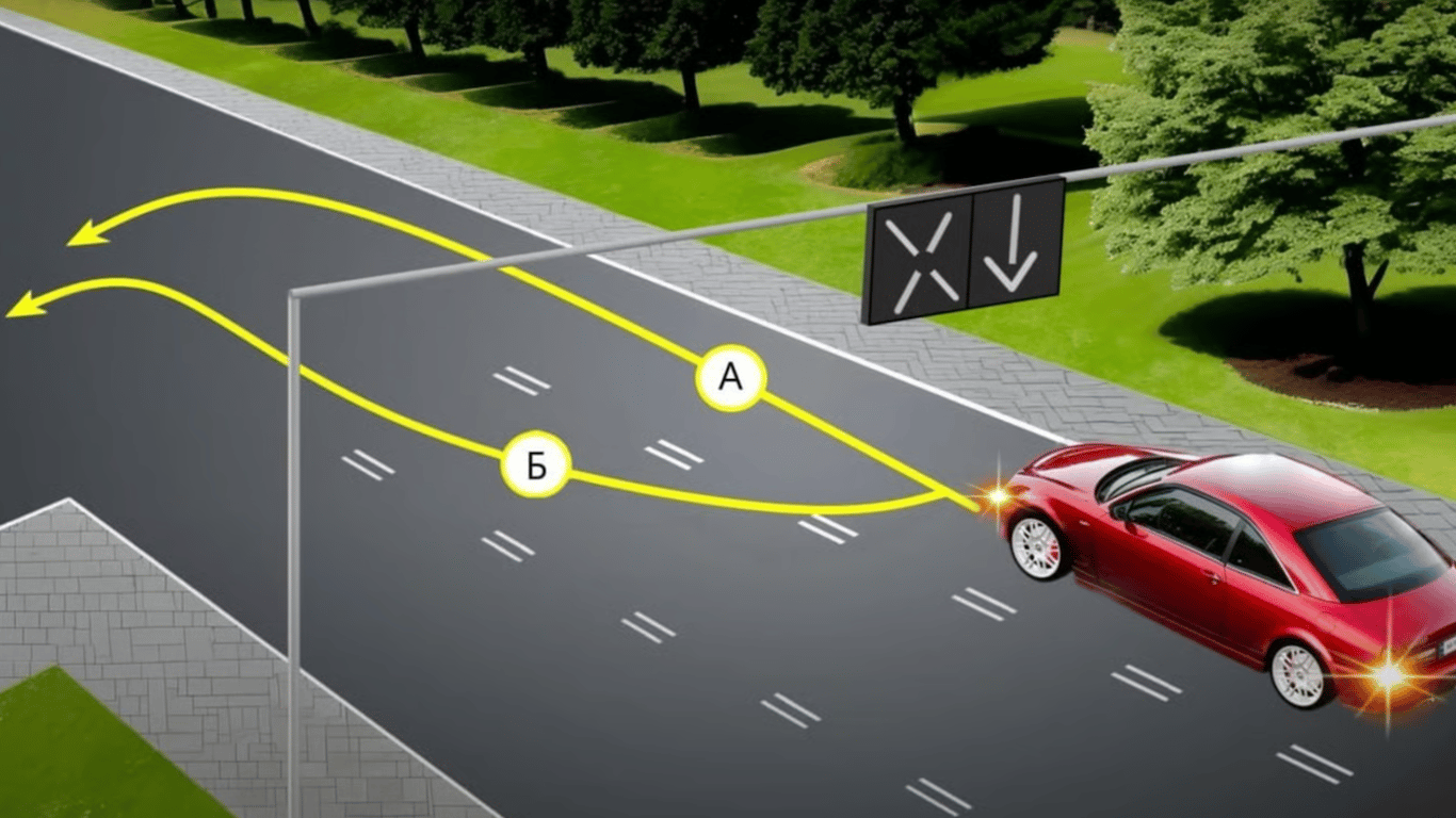 - траектория А — поворот с правой полосы, которую водитель уже занимает;