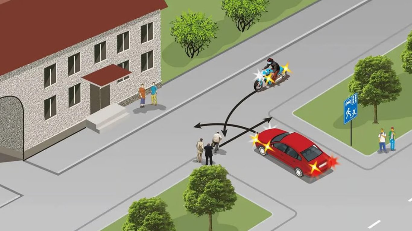 Как разъедутся водитель легковушки и мотоциклист? Видно, что водитель красного авто заезжает в пешеходную зону, а мотоциклист выезжает из нее.