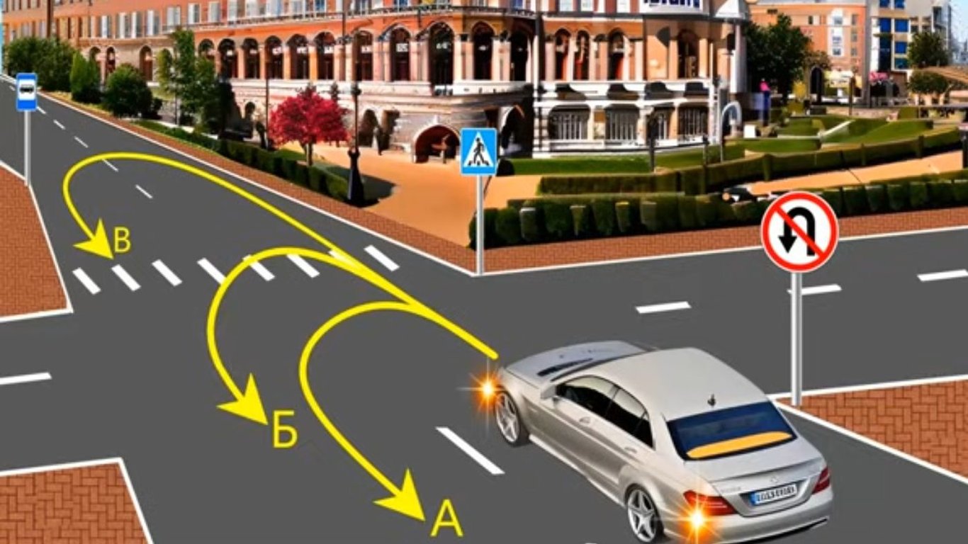 На перекрестке этот маневр правилами дорожного движения разрешается, но там установлен знак 3.24 "Разворот запрещен". Поэтому по траектории "А" водитель не может выполнить разворот.