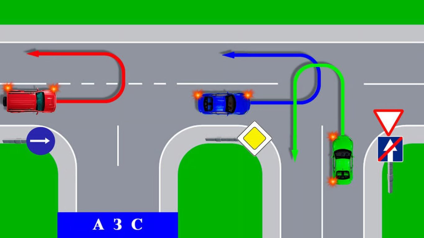 Но на дороге перед водителем зеленого автомобиля установлен знак 5.6 "Конец дороги с односторонним движением". То есть если водитель зеленой машины развернется, то будет двигаться против потока, а это строго запрещено.