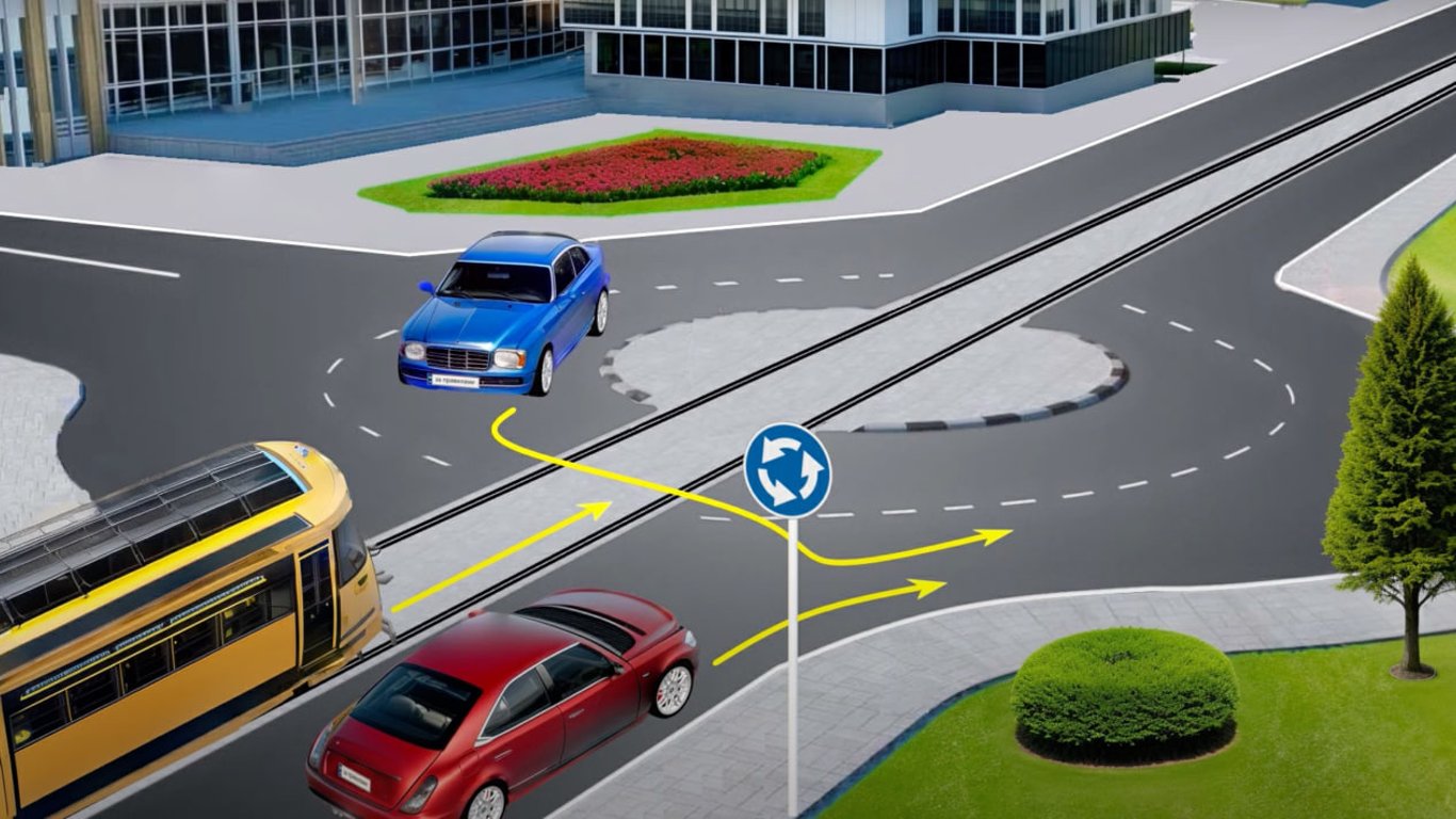 Следовательно, трамвай и красный автомобиль обязаны уступить дорогу синей машине, которая проедет первой. После этого водители трамвая и красного авто смогут проехать одновременно.