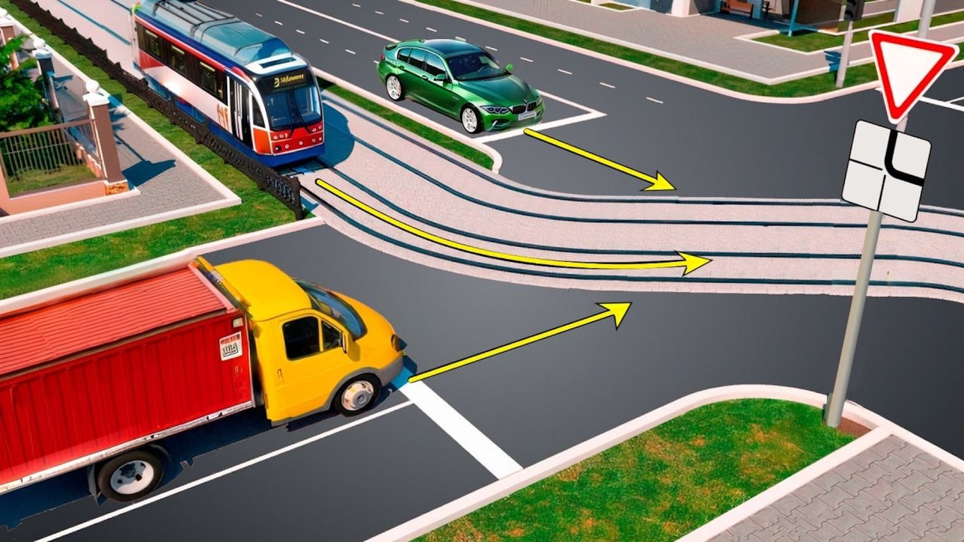 Итак, водитель трамвая имеет преимущество перед обоими автомобилями и проедет перекресток первым. За ним двинется водитель грузовика, ведь он приближается к зеленому авто с правой стороны.