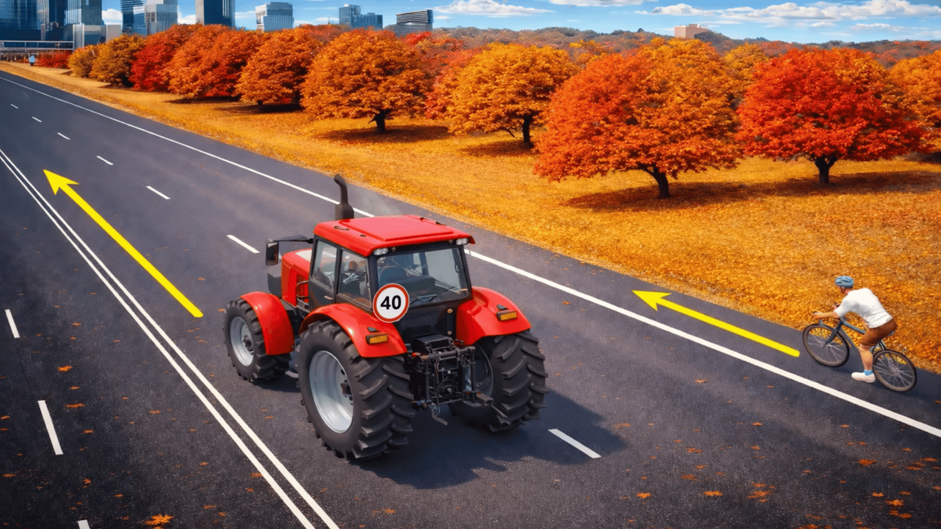 Трактор движется по левой полосе, хотя правая является абсолютно свободной. На транспортном средстве установлен опознавательный знак ограничения максимальной скорости 40 км/ч.