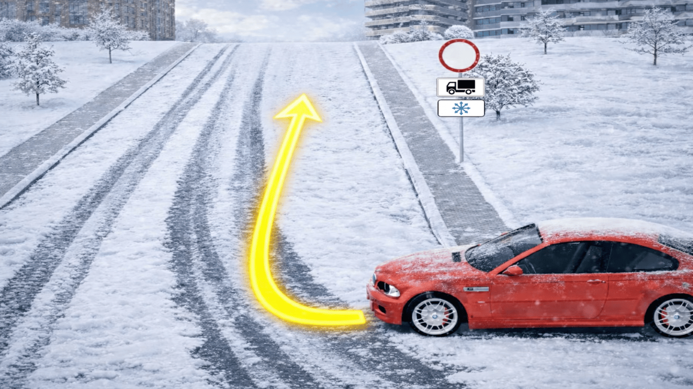 Водитель красного легкового автомобиля планирует повернуть направо. На въезде установлен знак 3.1 "Движение запрещено", таблички 7.5.1 "Вид транспортного средства" (распространяет действие знака исключительно на грузовые автомобили с разрешенной массой более 3,5 тонны) и 7.12 "Гололед" (означает, что знак действует только в период гололеда).