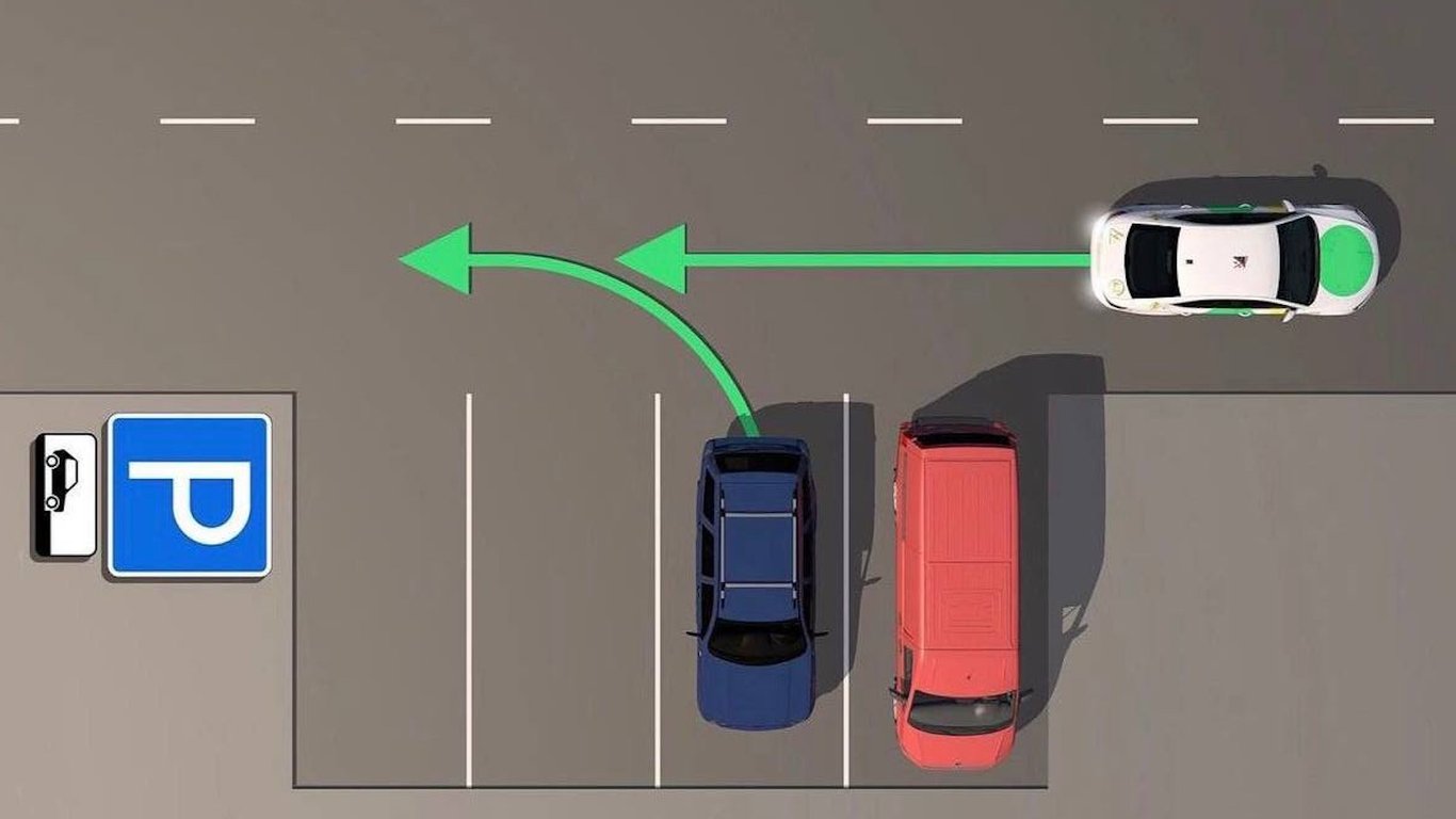 Водитель белого автомобиля движется задним ходом с намерением припарковаться. В то же время водитель синей машины выезжает со стоянки.
