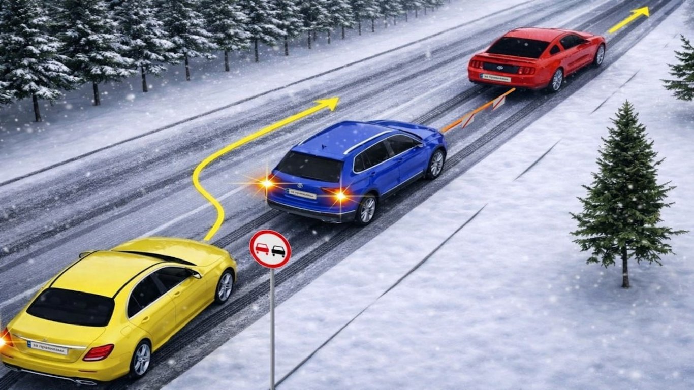 На участке дороги установлен запрещающий знак 3.25 "Обгон запрещен". В то же время водитель желтого автомобиля пытается обогнать красную машину, которая буксирует синюю легковушку.