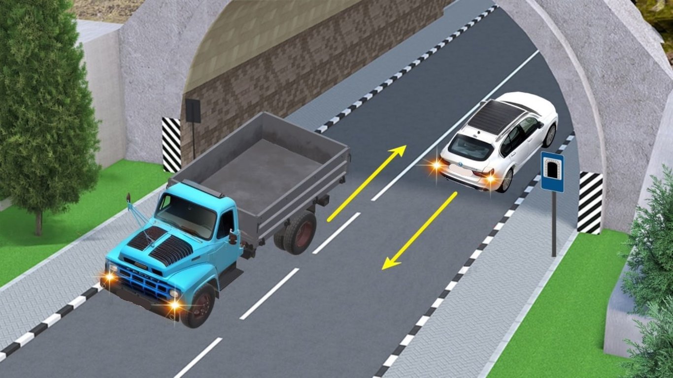 На участке дороги водитель грузовика заезжает задним ходом в тоннель, а водитель белой легковушки выезжает задним ходом из тоннеля.