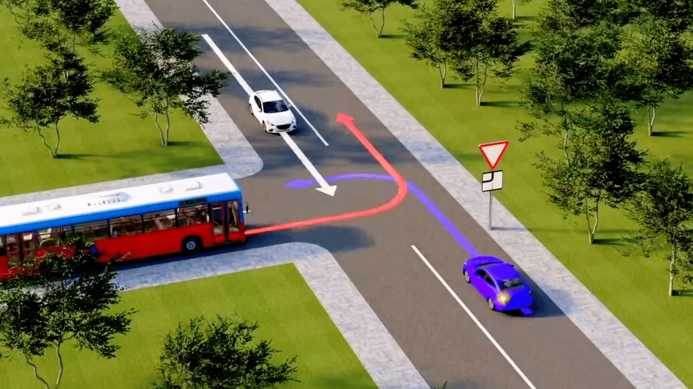 На перекрестке водители автобуса и синего автомобиля поворачивают налево, а водитель белой машины движется прямо.