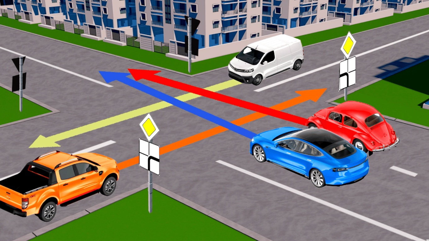 Таким образом водитель оранжевого пикапа должен пропустить красный и синий автомобили. Так как траектория его движения не пересекается с водителем белого авто, то они проедут перекресток последними вместе.