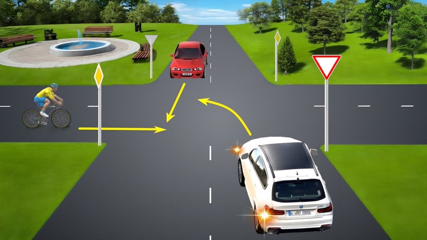 На перекрестке велосипедист и водитель красного автомобиля проезжают прямо, а водитель белой машины поворачивает налево.
