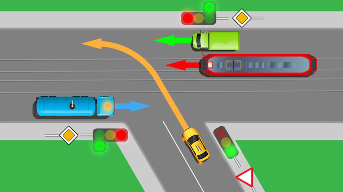 Итак, первым должен двинуться водитель желтого авто, после этого перекресток проедет остальные транспортные средства.