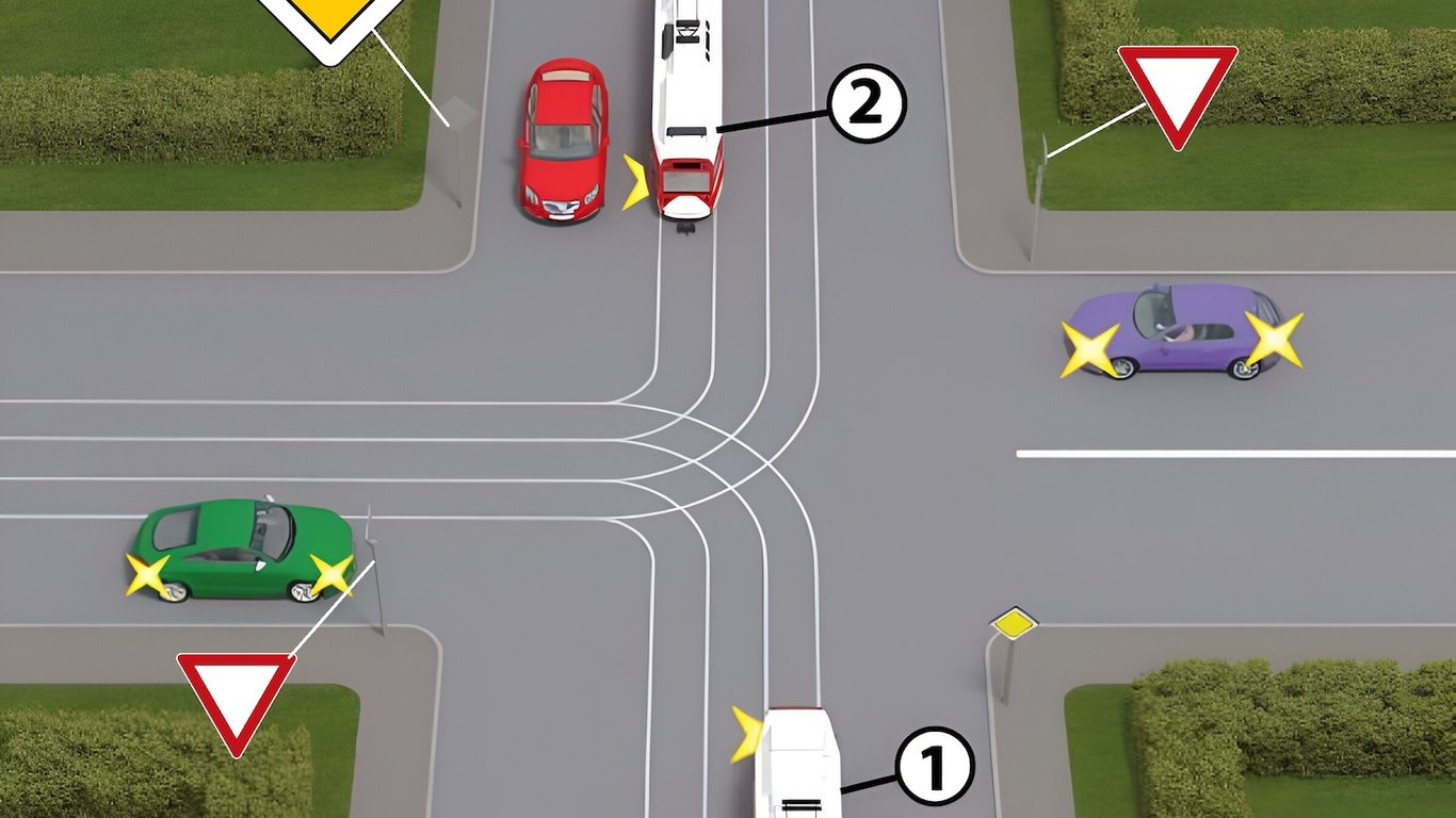 На перекрестке водители трамвая №1 и фиолетового автомобиля поворачивают налево, водители трамвая №2 и зеленого автомобиля — направо, а водитель красной машины движется прямо. Перекресток нерегулируемый (отсутствуют светофоры и регулировщик), но на нем есть знаки приоритета.