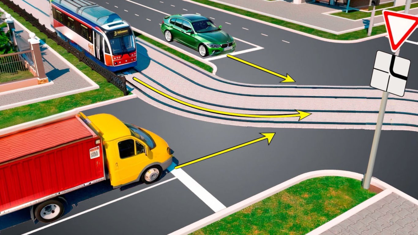 На перекрестке водители трамвая, легкового автомобиля и грузовика проезжают прямо. Так как участок не оборудован светофорами, разъезжаться водители будут по знакам приоритета 2.1 "Уступить дорогу" и 7.8 "Направление главной дороги".