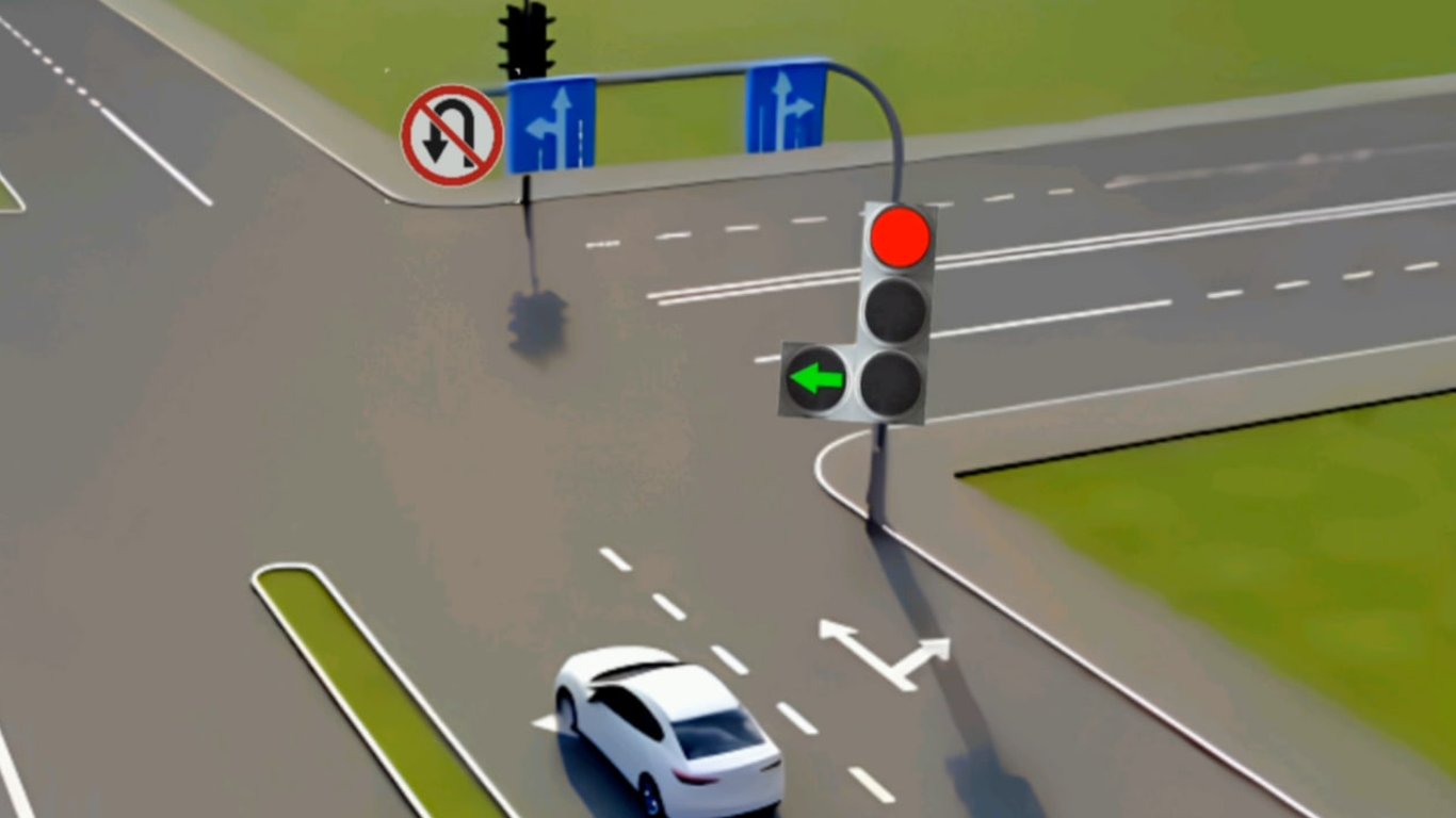 На основной секции светофора горит красный свет, так что для проезда прямо придется ждать зеленый сигнал. Но вместе с основным красным в дополнительной секции светится зеленая стрелочка в направлении налево, куда водитель белого автомобиля имеет право повернуть.
