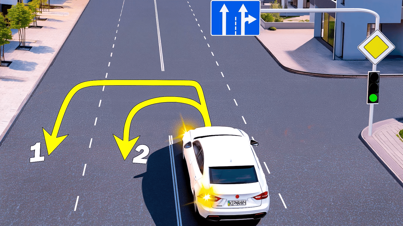 Задача на знание дорожных знаков и по теме о регулировании дорожного движения. По какой траектории может развернуться водитель белого автомобиля в изображенной на перекрестке ситуации?