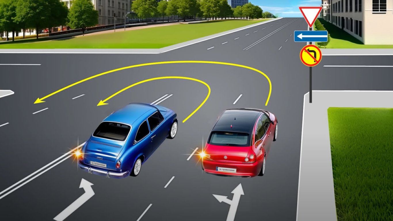 Таким образом, водитель синего авто может смело выполнять свой маневр. А ПДД нарушит только водитель красного автомобиля.