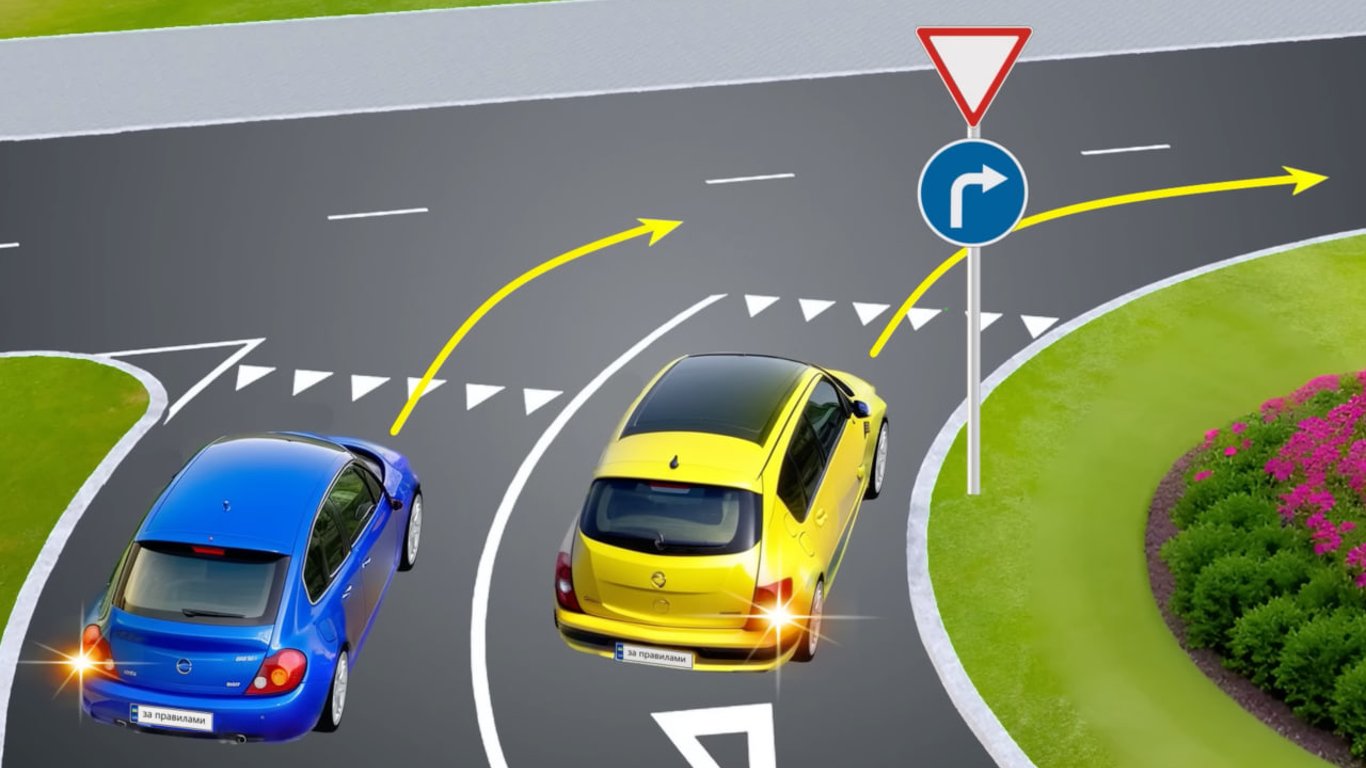 На перекрестке водители синего и желтого автомобилей поворачивают направо.