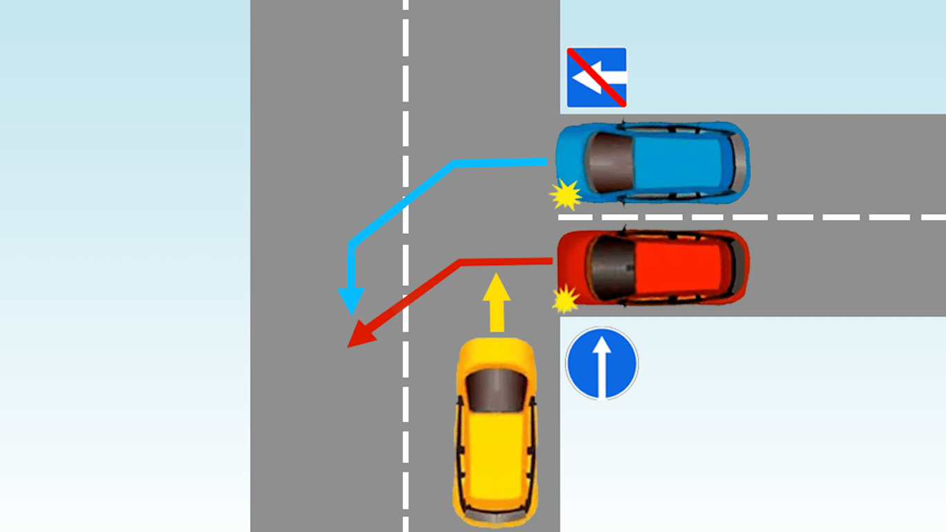 На перекрестке водитель желтого авто едет прямо, а водители красного и синего автомобилей поворачивают налево, выезжая с односторонней дороги, о чем свидетельствует знак 5.6 "Конец дороги с односторонним движением".
