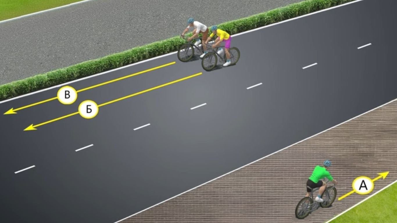 Все они двигаются прямо. Но если велосипедисты "Б" и "В" едут по дороге, то велосипедист "А" следует по тротуару.