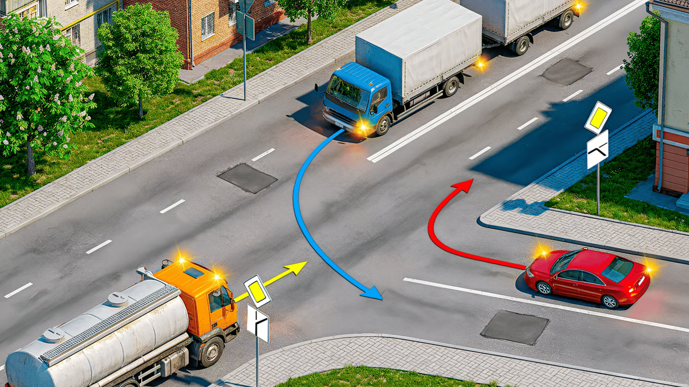 Перед водителями грузовика и легкового авто установлен знак 2.3 "Главная дорога" и табличка 7.8 "Направление главной дороги". Это означает, что дороги неравнозначные, а автопоезд находится на второстепенной дороге, поэтому он проедет последним.