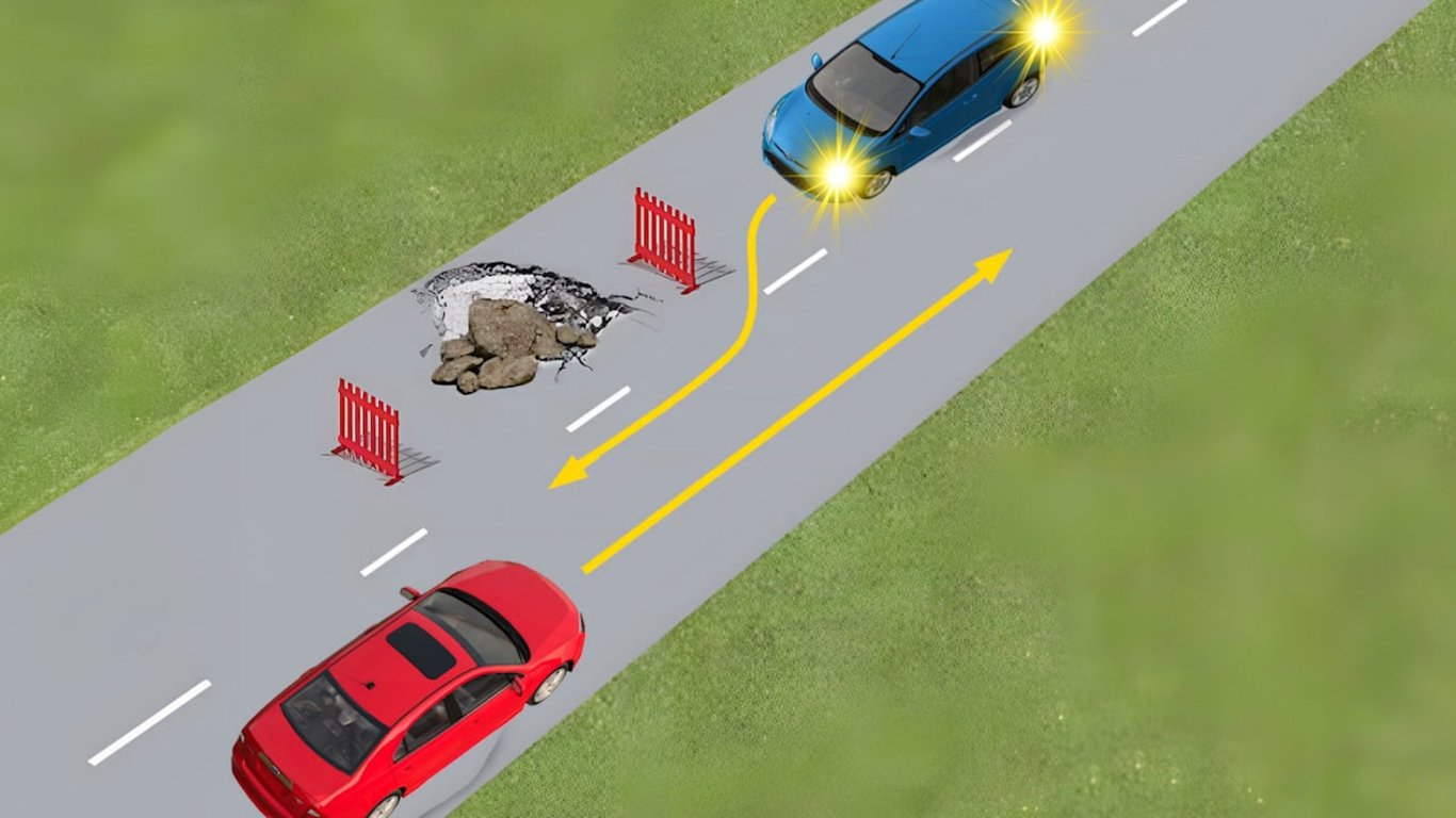 На ділянці дороги на зустріч одне одному рухаються водії синього та червоного автомобілів. На смузі синьої машини знаходиться перешкода у вигляді обгородженої ями в асфальті, яку водій може обʼїхати лише зустрічною смугою.