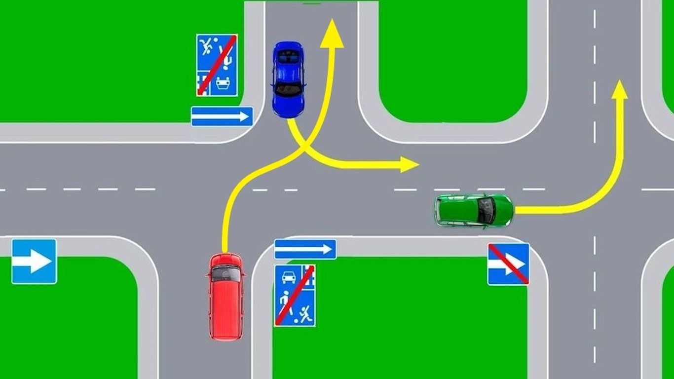 Задача з теми про початок руху та зміну його напрямку. Хто з водіїв автомобілів порушить правила у зображеній на малюнку ситуації?