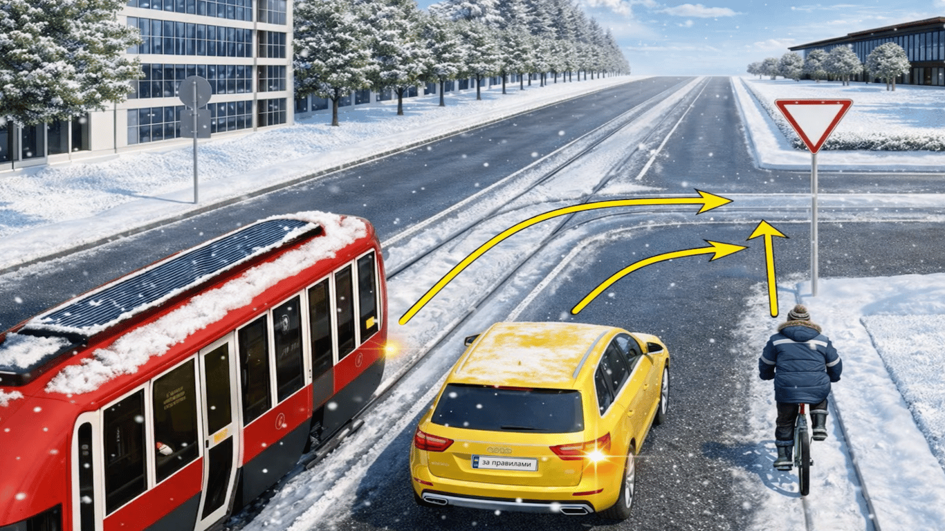 На перехресті трамвай та жовтий автомобіль повертають праворуч, а велосипедист проїжджає прямо. Усі три учасники руху знаходяться перед знаком 2.1 "Дати дорогу", отже, вони перебувають на другорядній дорозі та є рівнозначними між собою.