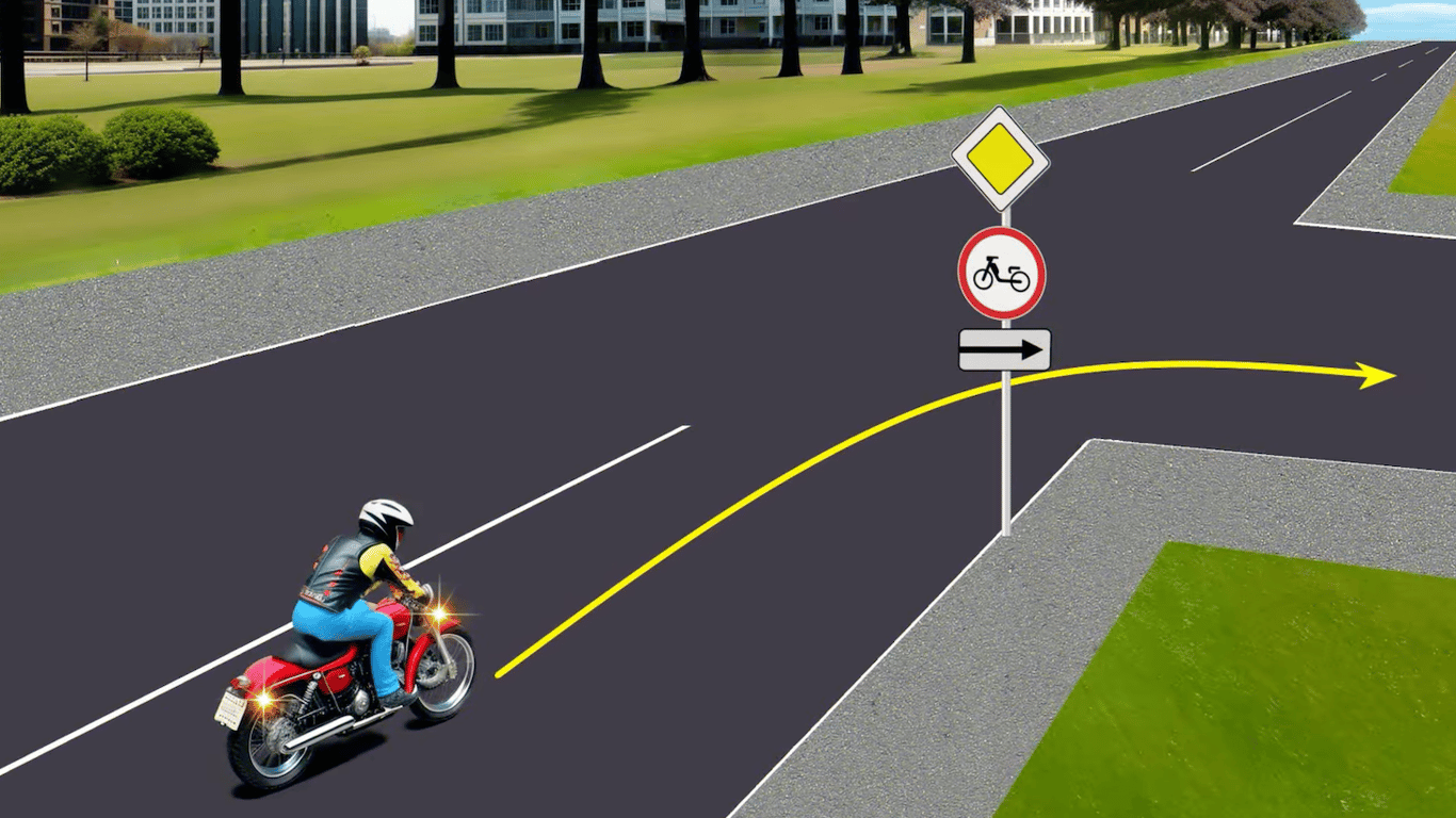 Задача на знання дорожніх знаків. Чи може мотоцикліст виконати поворот праворуч у зображеній на малюнку ситуації?